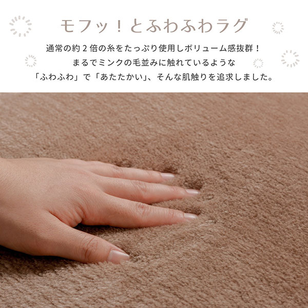 表生地は通常の約2倍の糸をたっぷり使用し、まるで ミンクの毛並みに触れているような『ふわふわ』で『あたたかい』を目指して肌触りを追求したラグ。