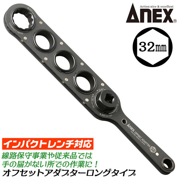 バリエーション【本体】AOA-30(アダプター本体)AOA-30S1(本体+全サイズソケットセット)AOA-30L(アダプター本体ロングタイプ)AOA-32L(アダプター本体ロングタイプ)【専用差替えソケット】AOA-3024(24mmソケット)AOA-3027(27mmソケット)AOA-3030(30mmソケット)AOA-3032(32mmソケット)AOA-3036(36mmソケット)【Cリング着脱用スナップリングプライヤー】AOA-SP(スナップリングプライヤー:先曲りタイプ)ANEX オフセットアダプター 32mm ロングタイプ インパクトレンチ対応 強力タイプ 大型 ボルト ナット ハイトルク 建築 橋梁 鳶 線路保守 狭所作業 手の届かない場所 更に奥まった箇所 インパクトドライバー 大型ソケット用 AOA-32L 兼古製作所 【更に奥まった箇所の締付に!高トルク対応!インパクトレンチで使える強力型!】 2